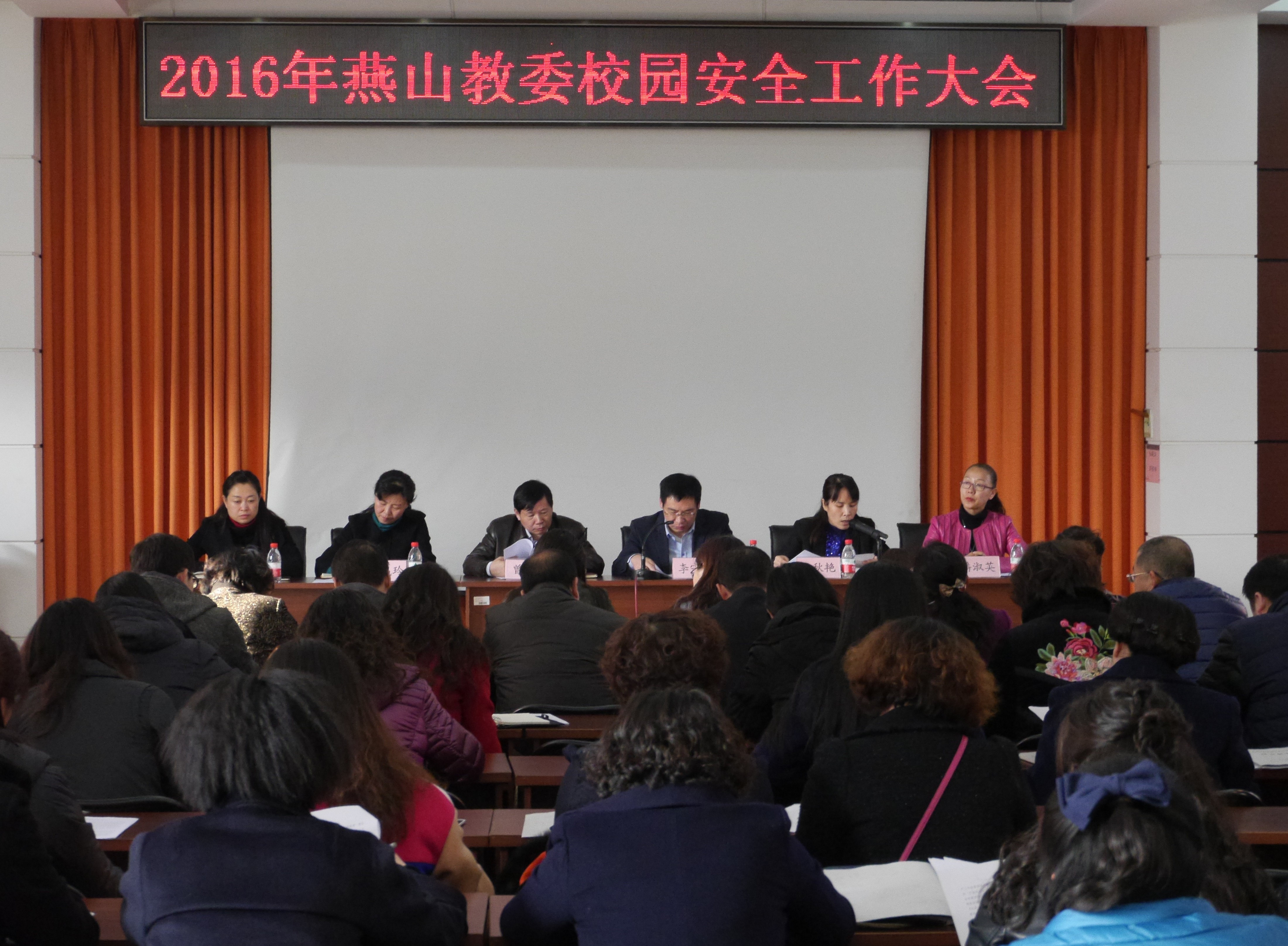 2016年3月2日下午,燕山教委在教研中心阶梯教室召开了2016年校园安全工作大会,教委二级班子和各学校、幼儿园的党政正职、保卫干部及教委机关各科室负责人参加会议。会议由燕山教委党委书记李守业主持。