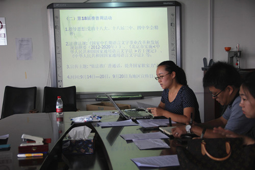2015年9月11日上午9点,燕山语委办组织召开第18届全国推广普通话宣传周活动布置会。中教科科长张岳川及地区中小学语言文字负责人参加会议。